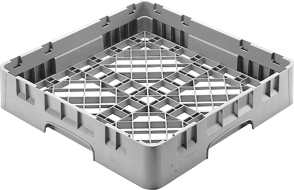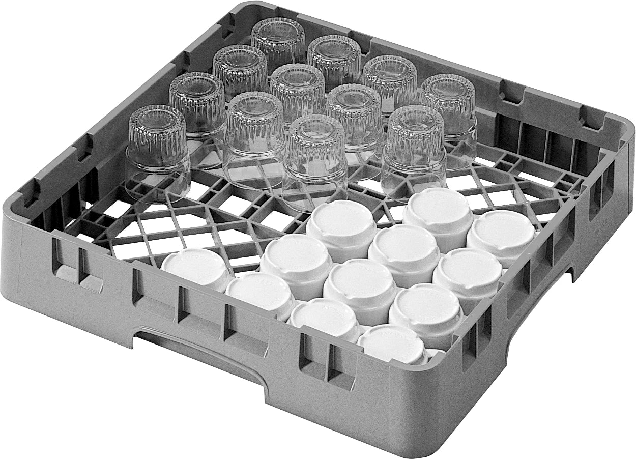 Grå Cambro opvaskebakke til glas og kopper. Du kan forhøje den med en bundramme og eventuelt en eller flere toprammer ovenpå, hvis du har finere/mere skrøbelige glas. For eksempel vinglas og ølglas.