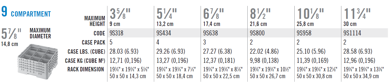 Topramme med 9 rum til glas op til 14,8 cm i diameter, typisk brugt til martiniglas, karafler og kander. Den passer til Cambro kop- og glaskurve i forskellige farver. Husk at købe bundramme til, som helst skal placeres mellem glaskurven og toprammen.