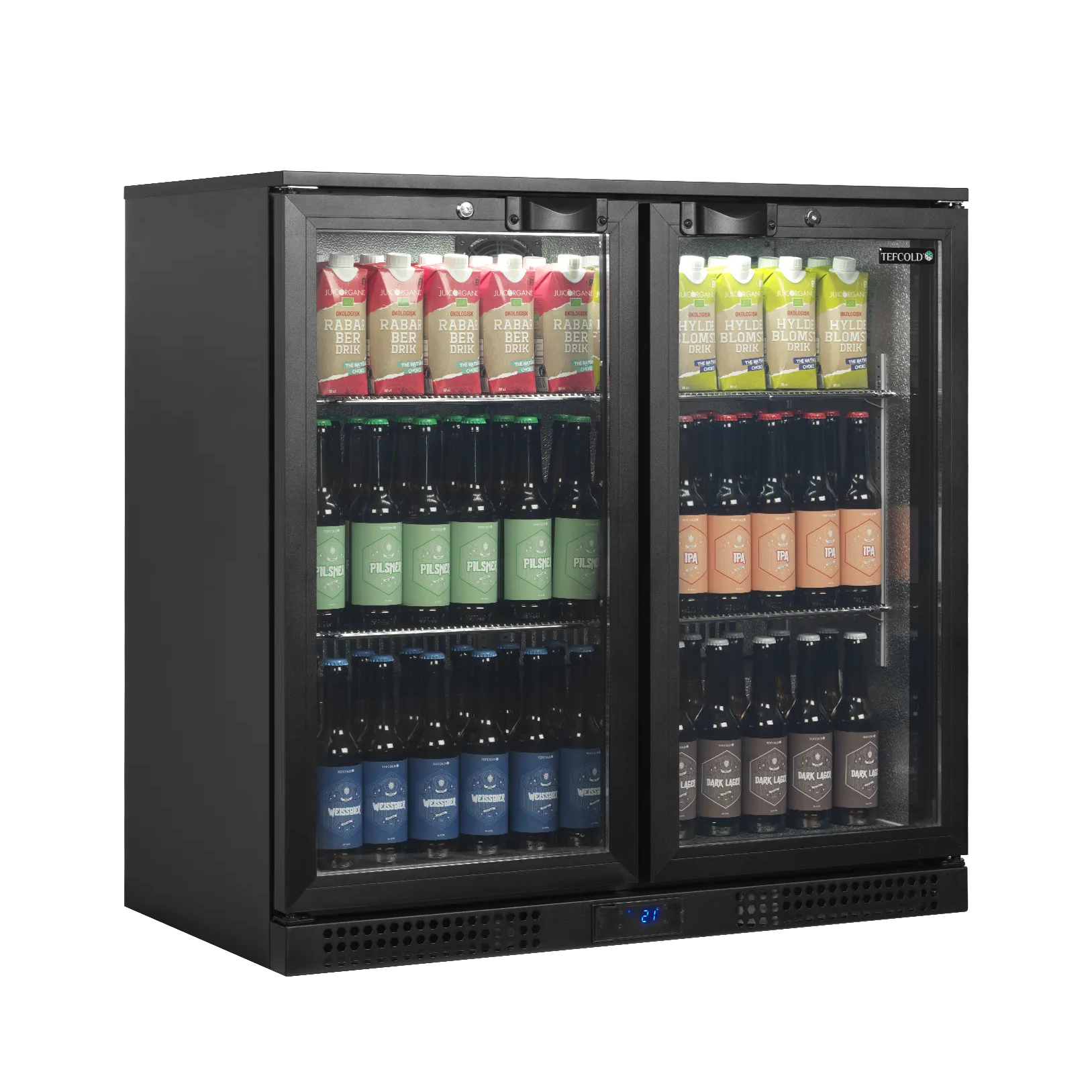 Tefcold backbar med hængslede døre til øl eller sodavand. Ideel til at have stående under en bordplade. Lækkert LED-lys, beklædt med aluminium indvendigt og med lås. Et rigtigt kvalitetsskab til 276 stk. 0,33 liter dåser eller 143 stk. 1/2 liter flasker. + 2 til + 10 grader. B:90 x D:52 x H:90 cm.