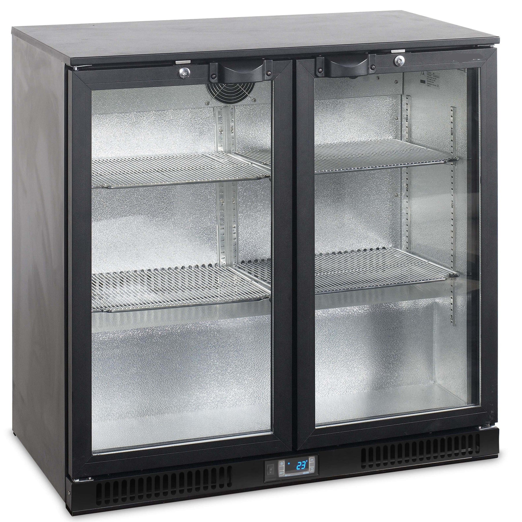 Flot dobbelt backbar til indbygning under disk eller bar. Med hængslede døre er 90 centimeter i højden og udstyret med glasdør og varmeudblæsning i fronten. Perfekt som øl køleskab eller andre drikkevarer og ingredienser til den moderne bar.