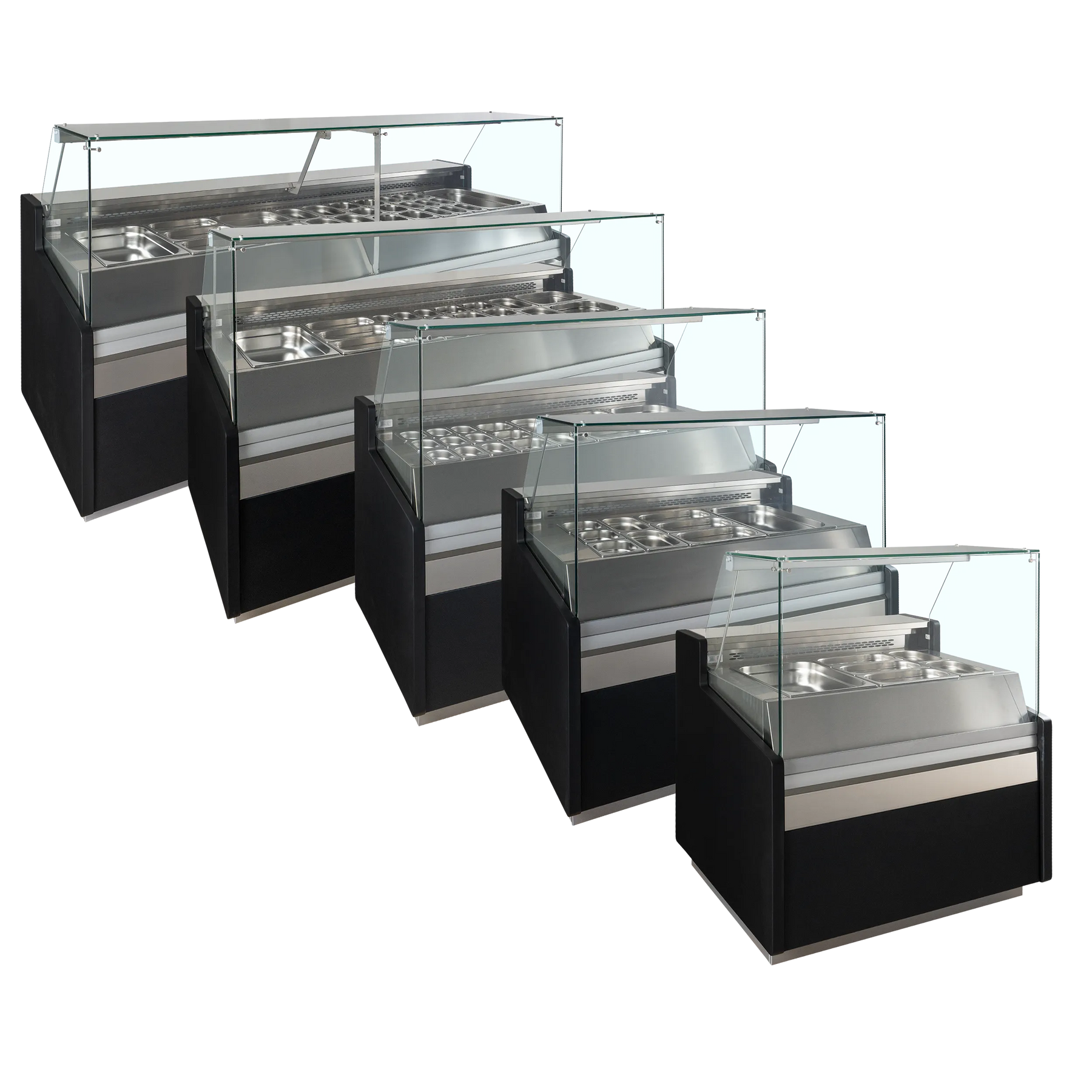 Flot og praktisk disk til takeaway forretning. Egner sig til GN bakker, så du kan sammensætte en opsætning med større og mindre bakker. Praktisk 25 cm dyb bordplade i rustfrit stål til at skære bagel/sandwich eller have en wrap liggende. Flad topglas på fronten. Det letter ekspeditionen. Ventileret køling som sikrer temperaturen er korrekt og dine råvarer holder sig friske. Opbevaringsplads under disken. Frontglas kan let slås ud, for en nemmere rengøring sidst på dagen.