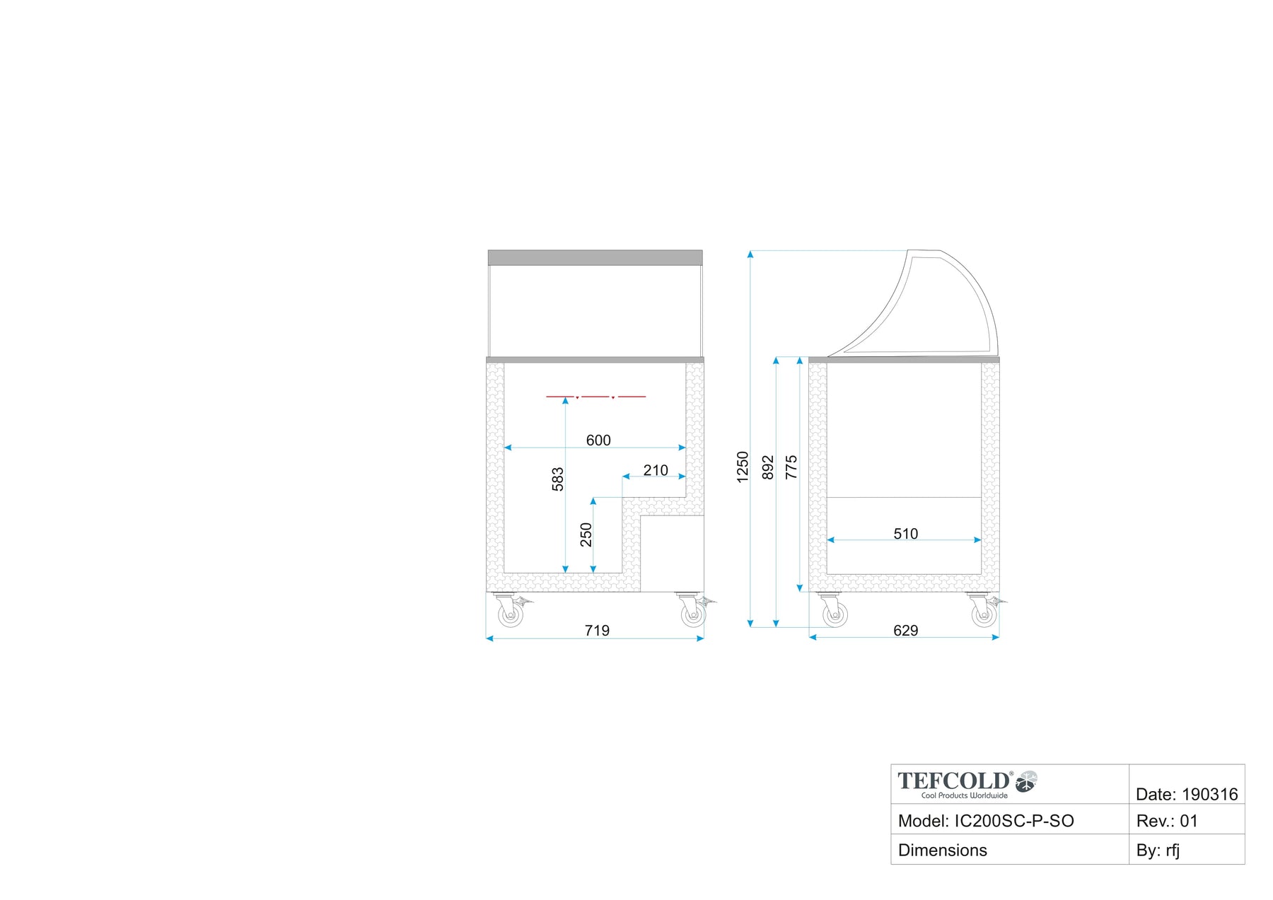 IC201SC+SO er en displayfryseboks på hjul med skydelåg og buet frontglas. Den fungerer på steder, hvor man sælger almindelig fabriks-kugleis (ikke kvalitets flødeis eller gelato).