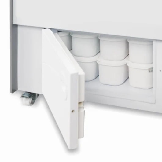 The counter is on wheels, so it is easy to pull out for maintenance. Heating wires in the front glass prevent condensation and the small top plate is suitable for having an ice cream cone holder or napkins standing. The night curtain is pulled down after the working day to reduce cold loss.
