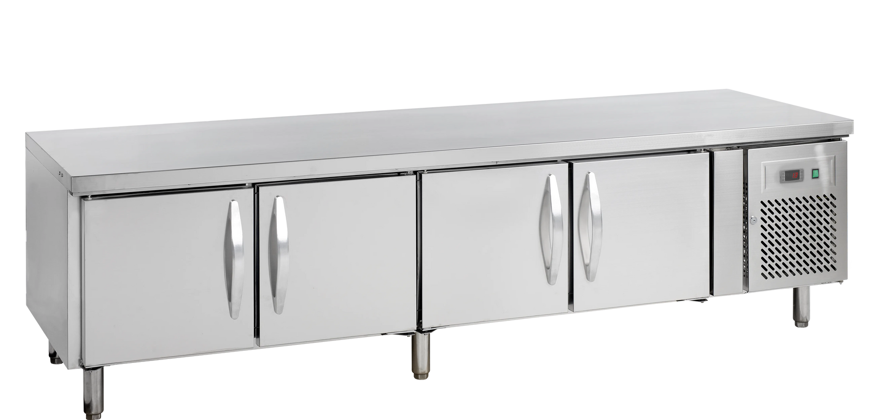Practical low stainless steel cooling table. Four self-closing doors with one GN 1/1 shelf in each. 67 cm high and therefore fits under a tabletop or in combination with frying equipment on top which provides a good working height. Dimensions: W: 223 x D: 70 x H: 67 cm.
