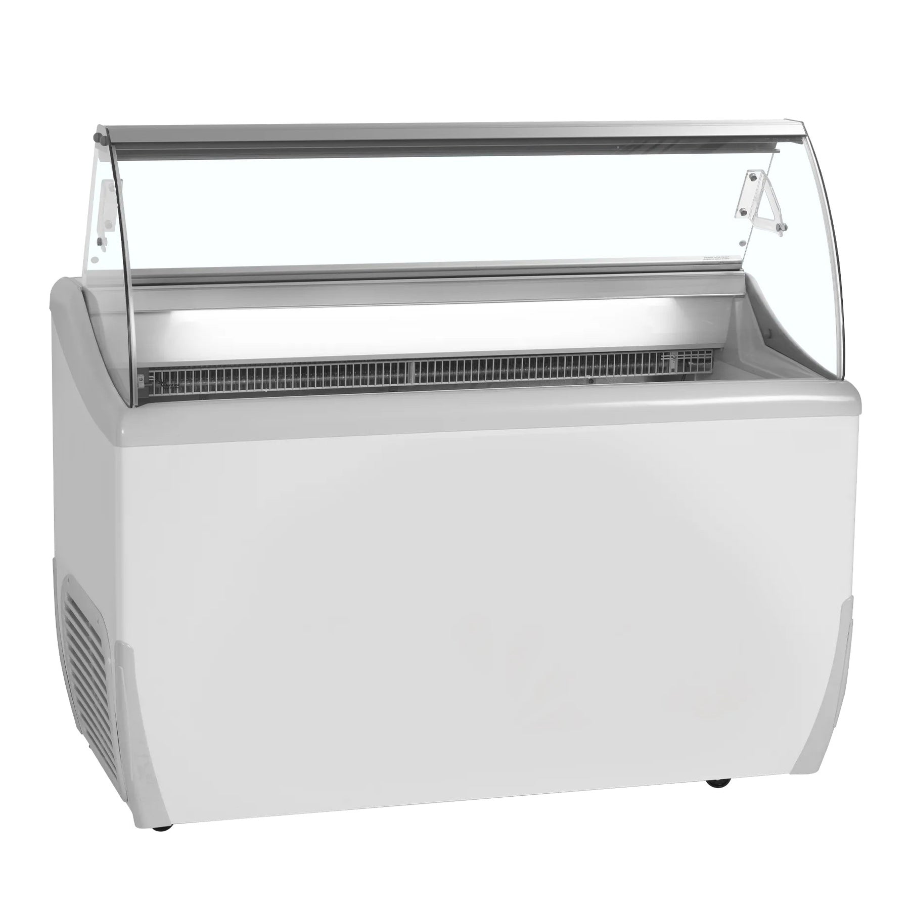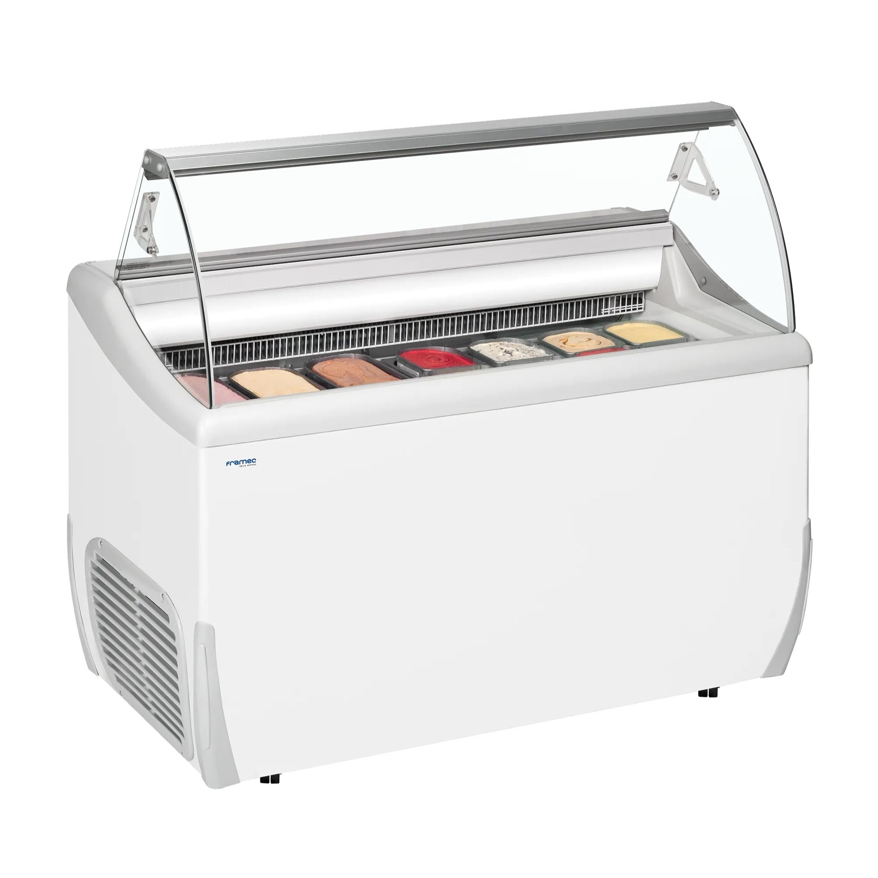 Excellent design with curved front glass and rounded corners, making it ideal for branding foil. Internal LED light puts the ice cream in the spotlight.
